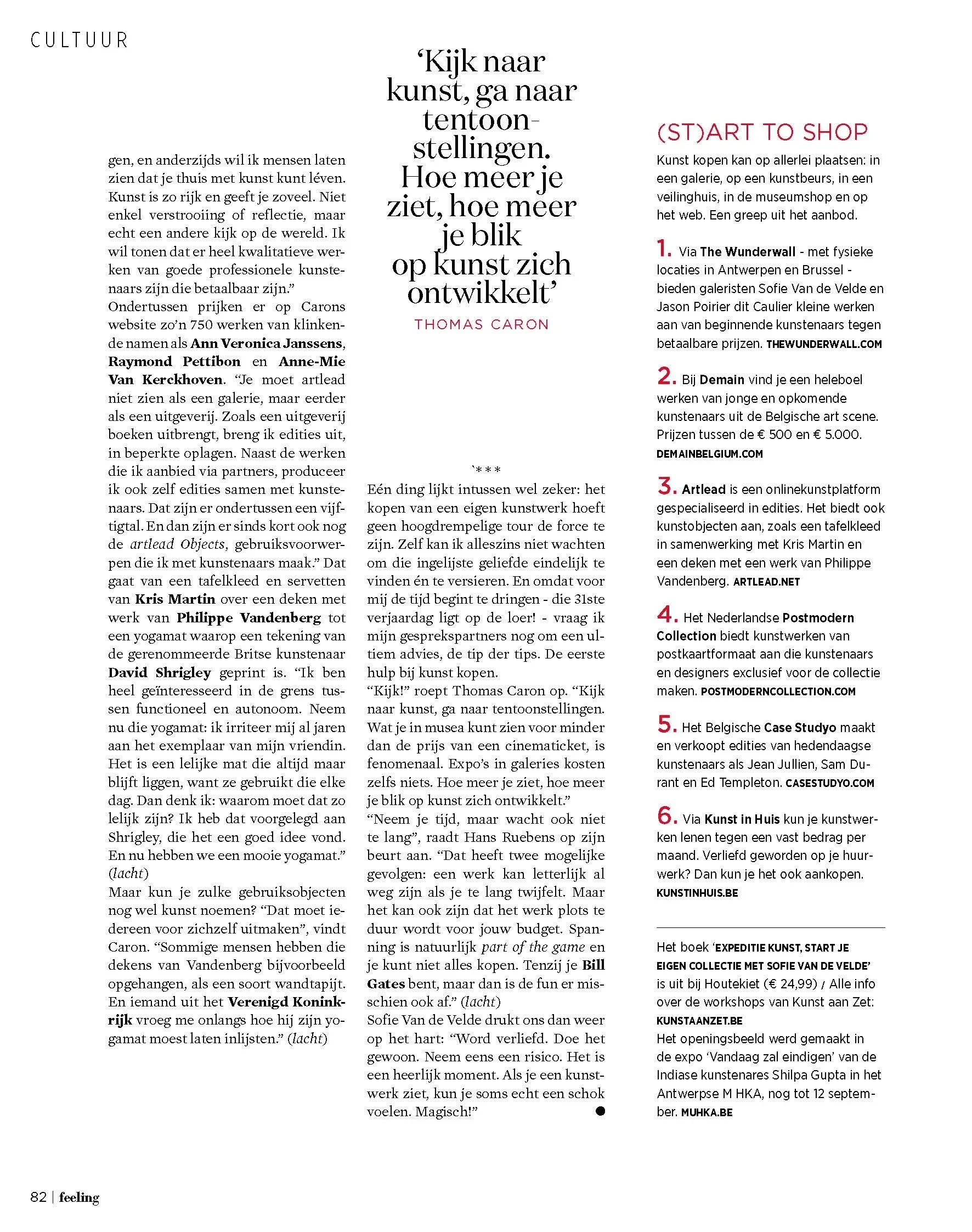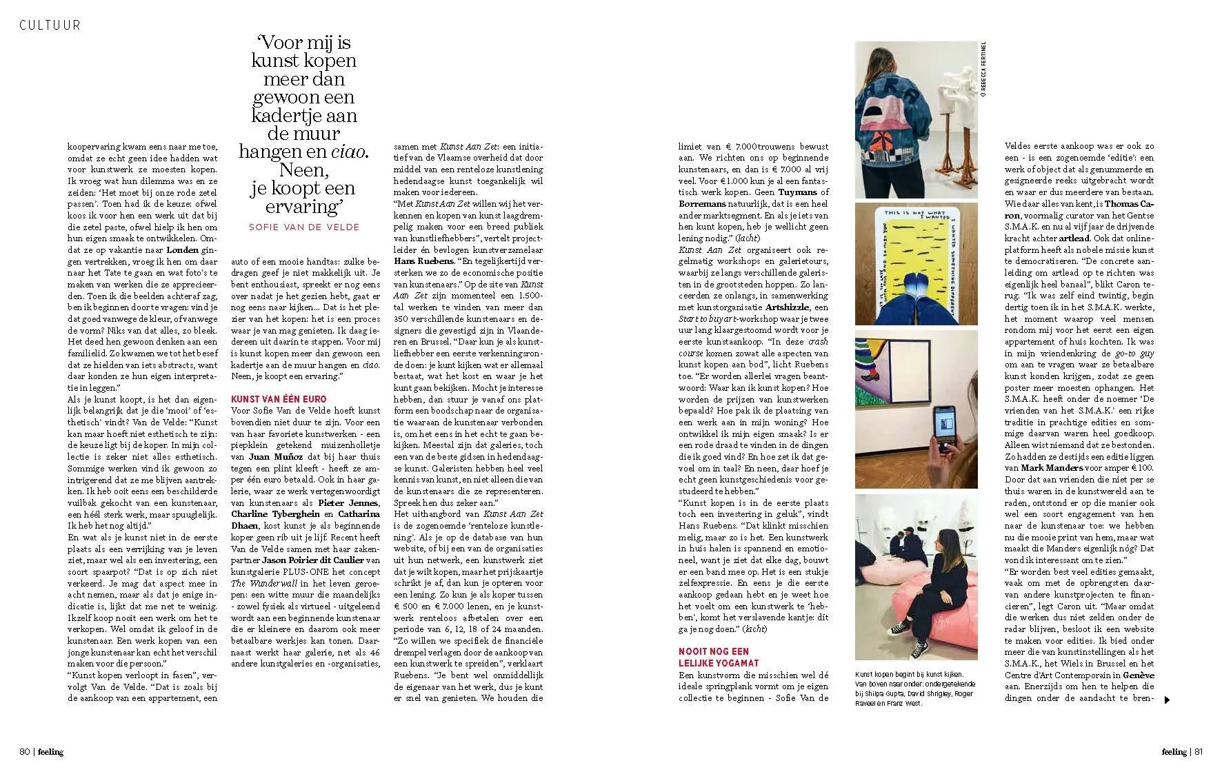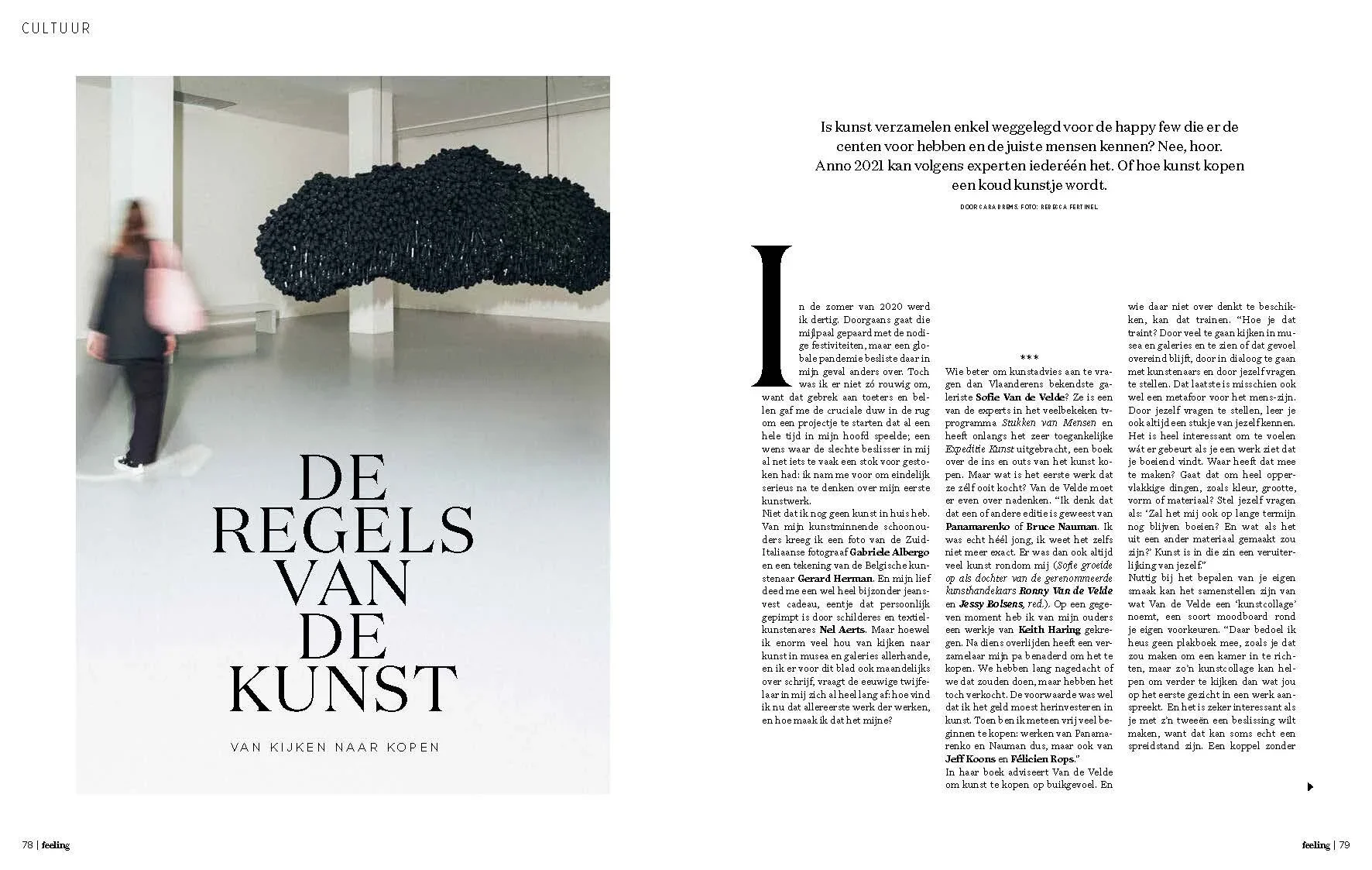 Pagina uit een tijdschrift met artikel en quotes over kunst, inclusief lijsten met kunstgalerijen en kunstenaars in Nederland.